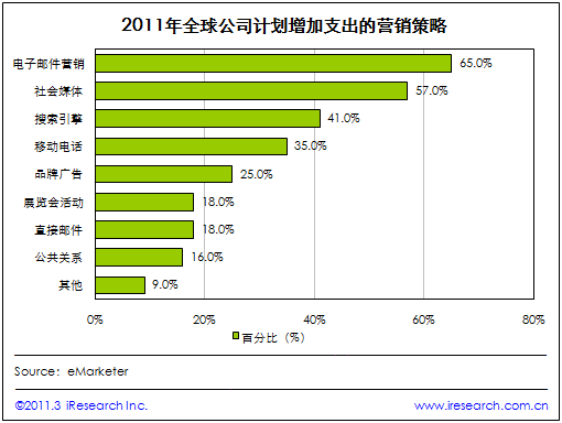 iResearch艾瑞咨询根据eMarketer发布的调查研究报告发现,2011年,全球65%的公司将在电子邮件营销中增加支出,57%的公司愿意在社会媒体营销中增加开支;而愿意在其他营销策略增加支出的公司均未超过五成。