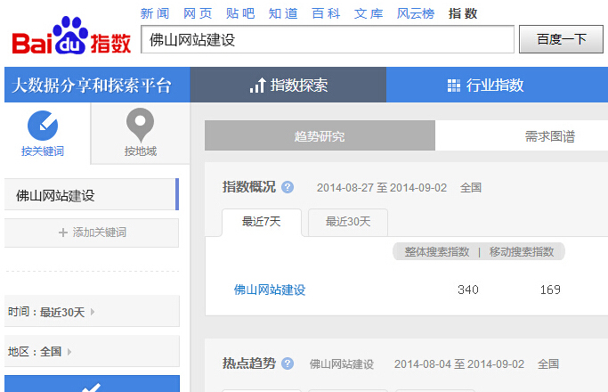 三、通过百度指数来了解相关关键词的搜索量,通过这个可以很直接的知道您所需要确定的关键词是否热门,是否有一定的搜索量,咱们还是以“手机网站建设,