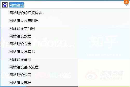 二、根据百度相关关键词这个功能进行网站主题关键词定位,比如网站主题是关于网站建设的,通过百度搜索网站建设,在搜索的时候下拉框里面就会出现如下图所示: